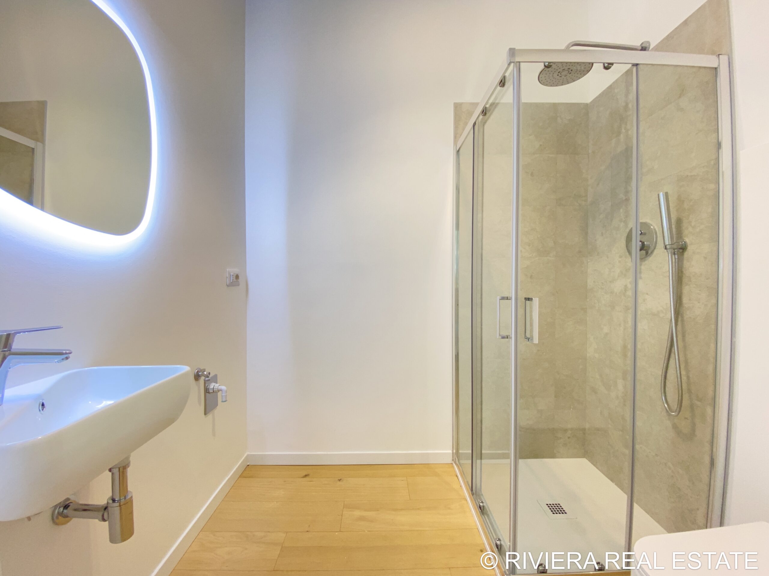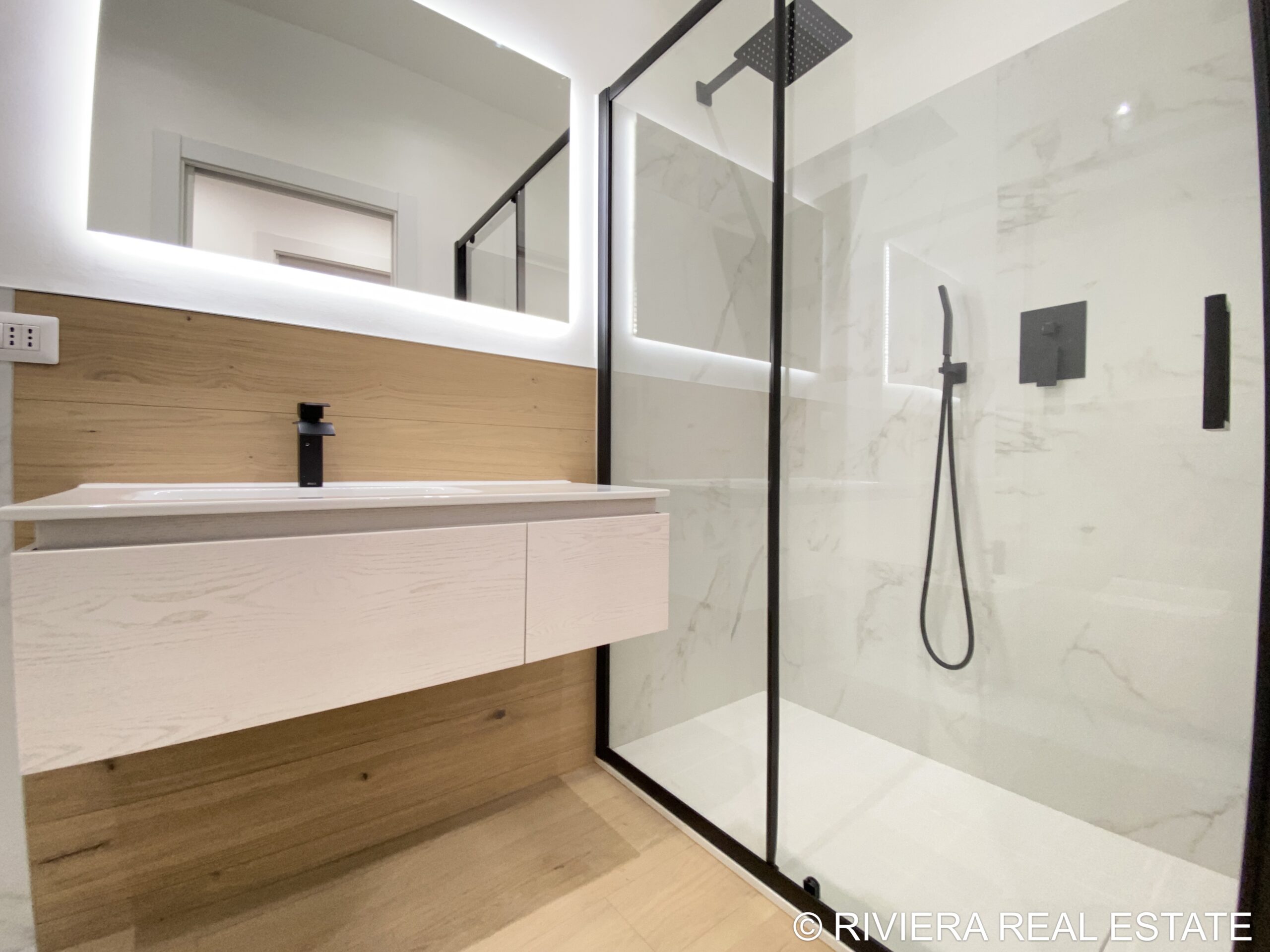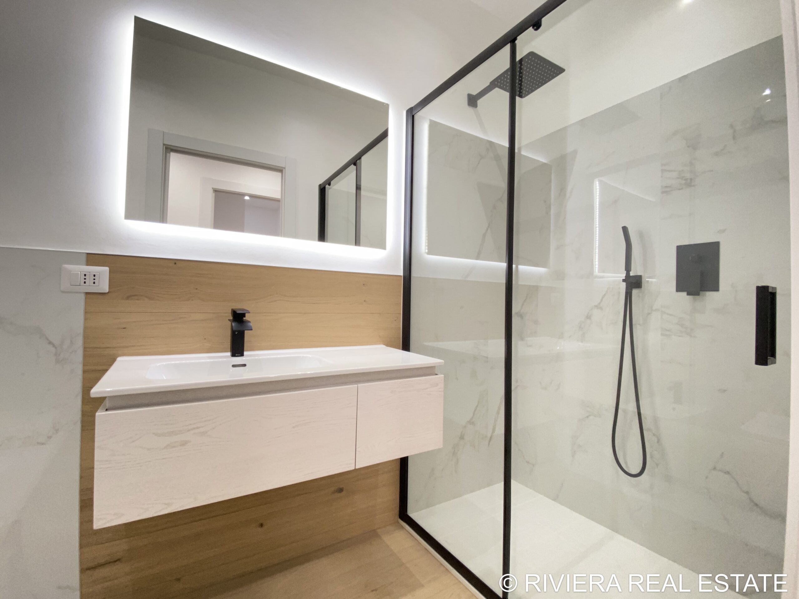 L’appartamento, FINEMENTE RISTRUTTURATO A NUOVO, è composto da un ingresso su un’ampia zona living con cucina a vista a penisola, due camere da letto, 2 bagni di cui uno in suite con box doccia e balcone.